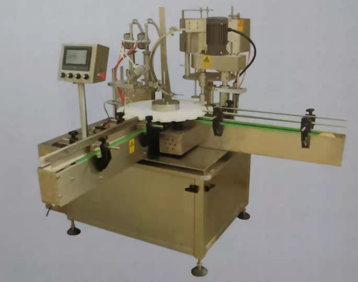 本機(jī)是集灌裝旋蓋于一體的灌裝機(jī),適用于多品種、多規(guī)格的液體灌裝和旋蓋,由PLC微電腦控制,一切操作均在觸摸屏上完成,伺服電機(jī)驅(qū)動(dòng)、容積式計(jì)量充填原理。旋蓋部分由供蓋、刮蓋、壓蓋、夾緊、輸瓶和旋蓋等來完成自動(dòng)旋蓋。整機(jī)具有運(yùn)動(dòng)穩(wěn)定可靠、生產(chǎn)效率高、適應(yīng)性強(qiáng)的特點(diǎn)。