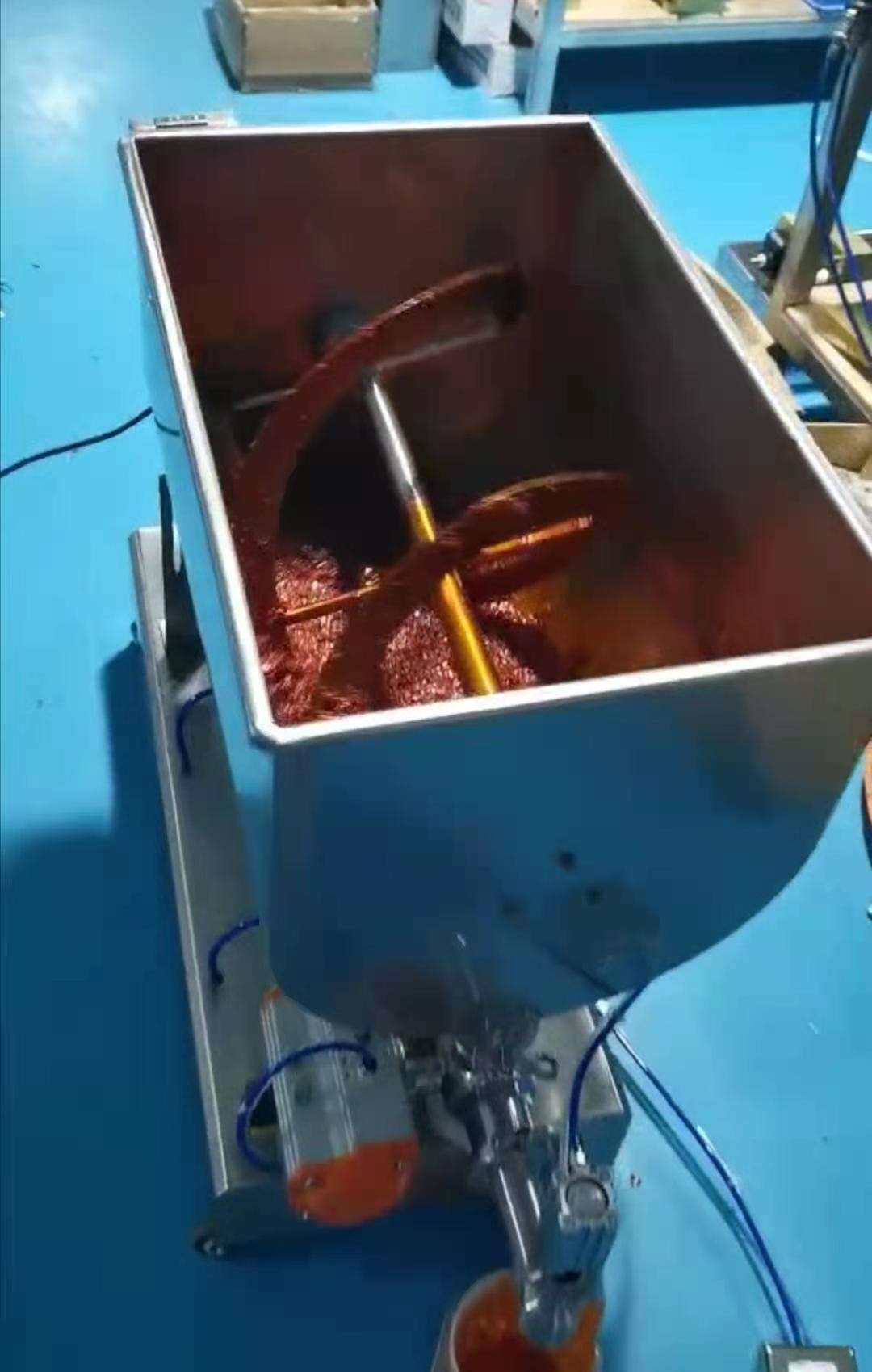 出口韓國的一臺半自動攪拌灌裝機(jī),用于攪拌灌裝魚露和各類海鮮醬料。