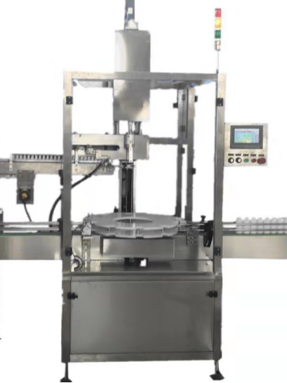本機(jī)采用人工放泵蓋進(jìn)入泵蓋輸送軌道取蓋<(利用轉(zhuǎn)盤定位瓶身)運(yùn)用伺服爪式旋蓋頭抓蓋、夾導(dǎo)管〉先下行拉直導(dǎo)管插入瓶口再同時(shí)伺服兩爪旋蓋到位(帶扭矩設(shè)定)